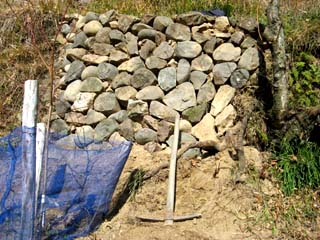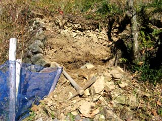ここにも崩れた石垣が…。 これは、ほぼ一年前少し崩れて 夏の大雨でドサッ!と崩れ こんな無惨な状態に! 土が湿っていると直しにくいので 雨がほとんど降らないこの時期が 修理の季節となります。 昨日、風邪気味の中 大きな石を大量に運んでて 暑くて汗ビッショリになったので シャツ1枚になってやってたら 夕方寝込んでしまいました。 この時期にシャツ1枚は無謀でした。 皆さん気をつけましょう!
