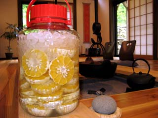 予報では午後から雨、とのことで 雨が降る前に桃に袋をかけようと 気合を入れて5時に起きたのですが すでに雨が降ってました。ザンネン なので、夏みかんの果実酒を作りました。 いろいろ作ってきたのですが 夏みかんのをまだ作ってませんでした。 半年後にはメニューの仲間入りです。