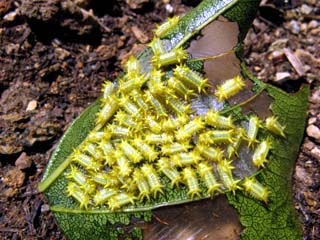 お食事中の方は気を付けて! 嫌いな方からの「ギャーっ!」という 悲鳴が聞こえてきそうです。 柿の葉を食事中のケムシ君の幼虫です。 成虫が何なのかは知りません。 まだ1cmにも満たないのですが こいつらが食べた後は 葉が透けたようになっています。 被害が大きくならないうちに 除去しとかないとなぁ〜。 干柿用の実がダメになってしまう!