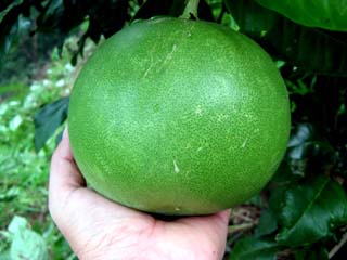 草刈りをしてて何か成ってるナ!と 見つけたのが、この柑橘。 まだ4年目なので成らないだろうと 思っていたのでチョットびっくり! 文旦の一種でカリフォルニア大学で 育成された新しいタイプの柑橘です。 最終的には800〜1000gくらいになるようですが すでに赤ちゃんの頭くらいの 大きさになってます。 1〜2月くらいに食べられるようですが それまで台風や病害虫に負けないように!!
