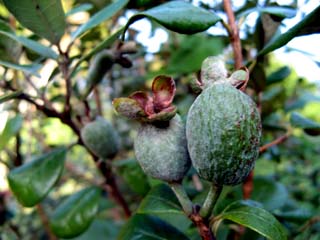 初モノが続きます。 東京から戻ると同時に植えて以来 この5年、花は咲くものの 結実に至らなかったフェイジョアが やっと実を付けてくれました。 2本あるうちの1本だけですが 10個ほど実を付けています。 実が落ちると食べられるようで 今、巷で話題の完熟マンゴーのようですが 無事に熟して落ちるのが待ち遠しいです!