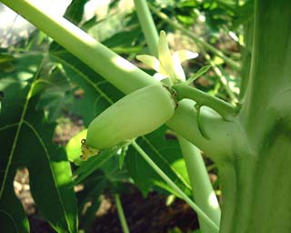 今日野菜畑のパパイヤを見に行って やっと親指大の実を見つけました。 去年より3ヶ月ほど早く植えましたが 結局実ができるのは去年と同じくらいなので やっぱり路地植えでの実の収穫は 徳島ではムリなのでしょうか? この実が収穫できるのを祈るしかありません。