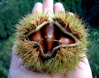 写真に写すと大きく感じますが 実は親指大くらいの芝栗です。 芝栗で分からない方には天津甘栗用の栗 といえば分かり易いでしょうか? この木は東京に出る時にはなかったので 親父が植えたのか?勝手に生えたのか? でも境界ギリに植えてあるので 親父が植えたんだと思います。 幹の太さからして10年生くらいかな? 今年は裏年なので実は少ないですが 天津甘栗に使うだけあって 実は小さいですが甘味があって バツグンに美味しいです! 芝栗だけで炊く栗ごはんはサイコーです!