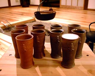 宿も10月で1周年を迎え 先日スポニチのコラムで紹介してくれた 元JRAの女性騎手だった細江純子さんから お祝いのビアカップをいただきました。 細江さんは愛知県の出身ですがその愛知県にある 「雅窯」で作られている陶器です。 説明書によると「焼き締め」という製法で 上薬を使わずに土をそのまま窯で石に近い 硬さまで焼き締めたものだそうです。 NHKで紹介された際、調べた処によると ガラスコップや瀬戸物と比較してビールの 泡立ちの量と持続時間が約3倍違うそうです。 実際ビールを入れて飲んでみましたが 確かに泡の持続時間は長いようです。 味も微妙に飲み易くなってるかな? あと冷たさも長持ちしてるみたいです。 フクロウのトレードマークもそうですが 囲炉裏を囲んでの雰囲気にピッタリの器で ほんとありがとうございました。 大事に使わせていただきます。