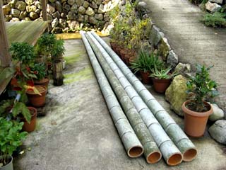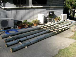 こういうのも毎年作ってると いい部分、悪い部分とかの 知恵が積み重なって 次第にいい物ができていきます。 製作のコツもわかってきて 作る時間もだんだん短くなってきました。 とりあえず今回は2時間程で この棚を作り終えました。 1本の竹だけでもカナリの重さですから 2本の棚になった時点で もう一人で持ち運びできません。 相棒に手伝ってもらって設置しないと!