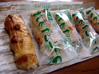 徳島というと「焼き竹輪」が有名ですが これはなんと「まんじゅう」。 その名も「ちくわまんじゅう」。 愛媛からお越しの石崎さまがお持ちの 某ガイドブックに、このまんじゅうが 阿南の銘菓として載っていて お土産に買いに行かれるというので 食べたことのない私も、どんな味か 確かめるために買いに行ったのです。 竹輪と同様に生地を竹に刺して 炭火で焼くということで見た目は 本物の竹輪ソックリのユニークなお菓子。 竹を刺してあった穴には白餡。 餡にはスダチの皮が練り込んであって 徳島銘菓の所以か?!是非お土産に!